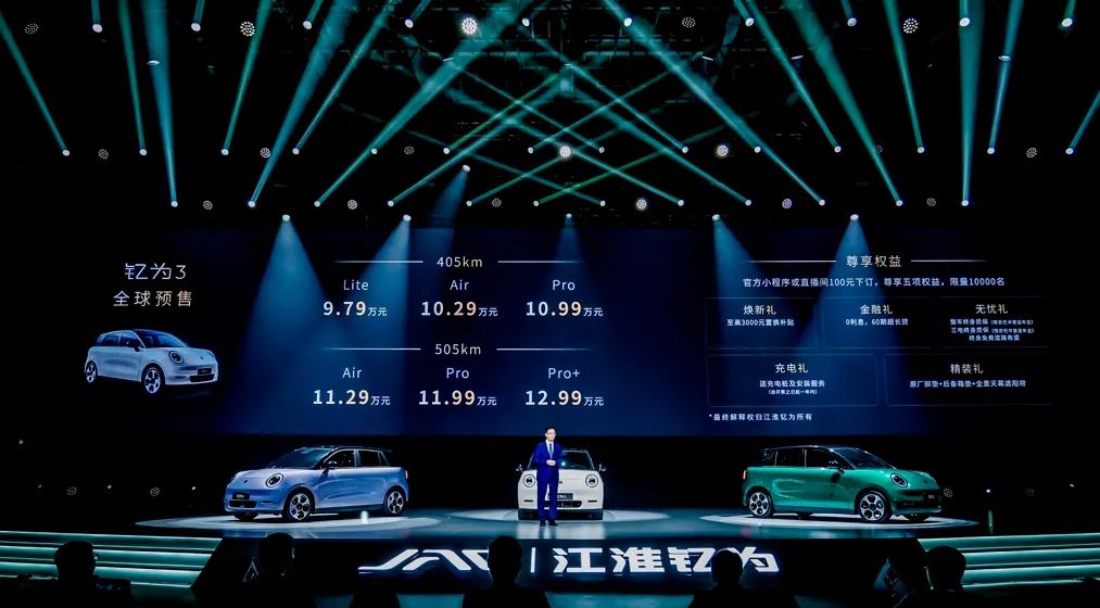 为了实现这个目标,江淮汽车这两个月很忙。先是在上月发布了旗下名为“钇为”的全新新能源品牌,再到本月又推出了这一新品牌旗下的首款产品——“钇为3”。这款产品定位为一款纯电动小型车,预售价格为9.79万元-12.99万元。