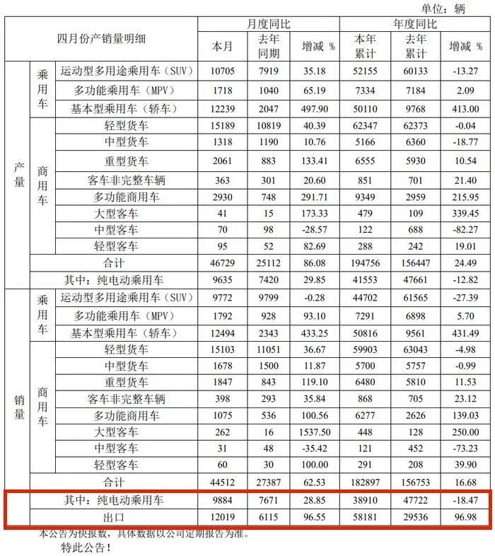 江淮纯电动车4月销量,图源江淮汽车4月产销快报
