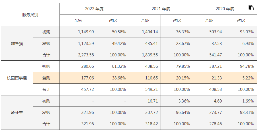 不过值得注意的是,2022年,辅导猫新客户初购金额较2021年已经出现下降,之所以能维持增长,完全靠公司老客户的复购。