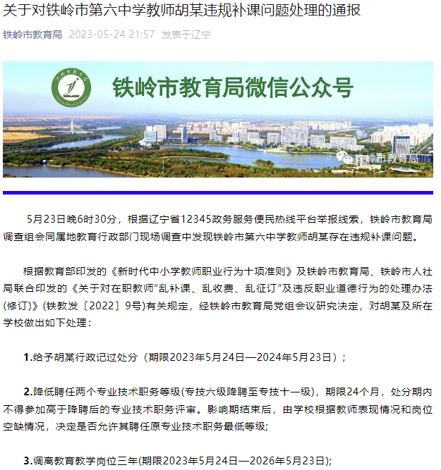 铁岭市教育局5月24日在其官微上通报,5月23日晚6时30分,根据辽宁省12345政务服务便民热线平台举报线索,铁岭市教育局调查组会同属地教育行政部门现场调查中发现铁岭市第六中学教师胡某存在违规补课问题。