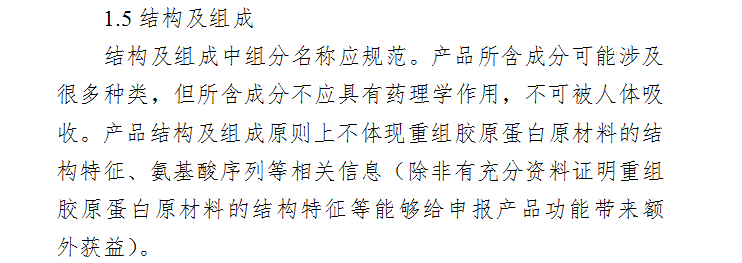 《注册审查原则》同时强调,产品所含成分可能涉及很多种类,但所含成分不应具有药理学作用,不可被人体吸收。产品结构及组成原则上不体现重组胶原蛋白原材料的结构特征、氨基酸序列等相关信息(除非有充分资料证明重组胶原蛋白原材料的结构特征等能够给申报产品功能带来额外获益)。