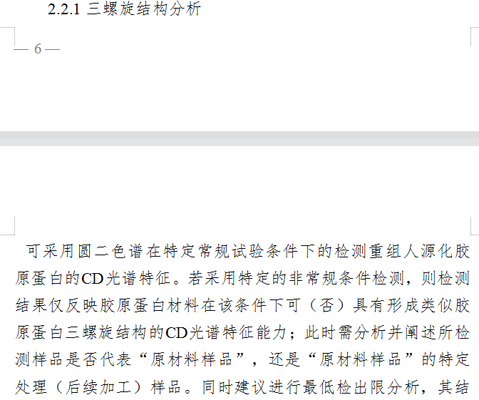 具体来讲,《评价原则》指出,企业可采用不同的分析方法对材料的分子量、等电点、氨基酸序列、各种翻译后修饰(如脱酰胺化、氧化、糖谱/糖基化修饰、脯氨酸羟基化等)进行充分鉴定,并进行适当的检测,提供相应的检测报告,以确认终产物具有拟宣称的原材料构象、聚集状态、降解状态及胶原蛋白高级结构。