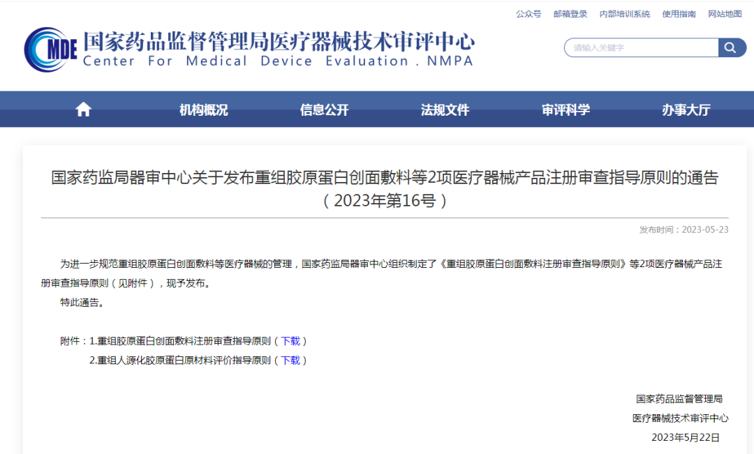 日前,国家药监局医疗器械技术审评中心公布了《重组胶原蛋白创面敷料注册审查指导原则》、《重组人源化胶原蛋白原材料评价指导原则》(以下简称《评价原则》)2项医疗器械产品注册审查指导原则,以进一步规范重组胶原蛋白创面敷料等医疗器械的管理。