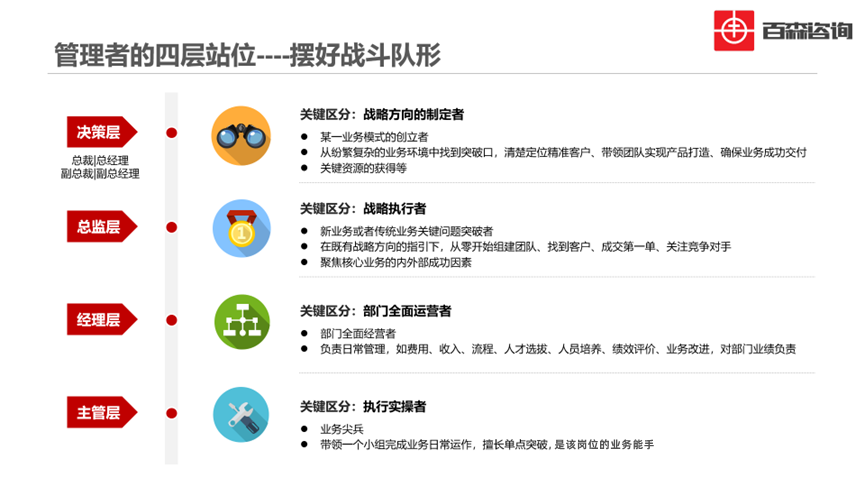 第一个维度:管理者的四层站位。一个战斗型的管理梯队一定包含决策层、总监层、经理层、主管层这四层管理岗位,而我们常讲“在其位,谋其政”,管理者是否站到了应有的位置,是否存在错位和缺位,又是否做着最该做的事情?四层站位的方法论可以说首次将企业管理岗位进行了清晰刻画,定义了不同层级应该关注与侧重的内容。