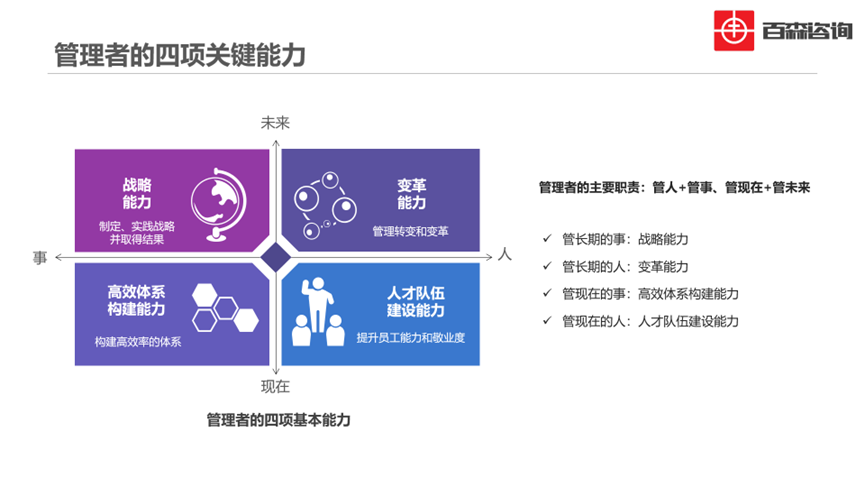 从图中可以看到,管理者的主要职责是“管人+管事、管现在+管未来”。中高层干部管未来的人、未来的事,要具备战略能力和变革能力。中基层干部管现在的人、现在的事,则要具备人才队伍建设能力和高效体系的构建能力。比如,团队怎么建,怎么识别人,怎么派活,怎么评价工作,怎么奖励?看似简单,很多干部却做的不够。