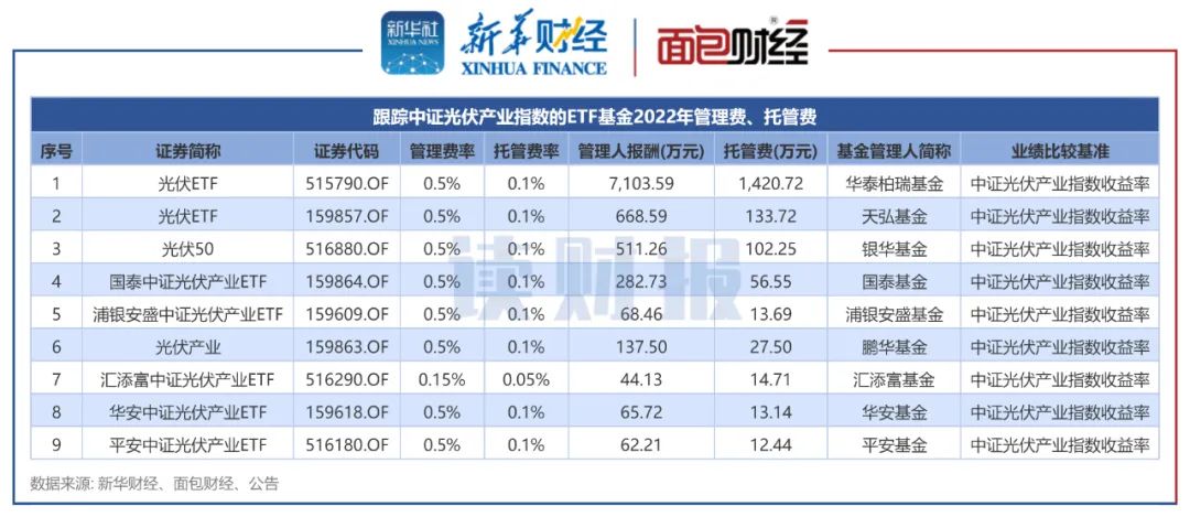 回顾2022年收费情况,华泰柏瑞光伏ETF因规模最大,收费也最多。该基金全年共收管理费7103.59万元、托管费1420.72万元。