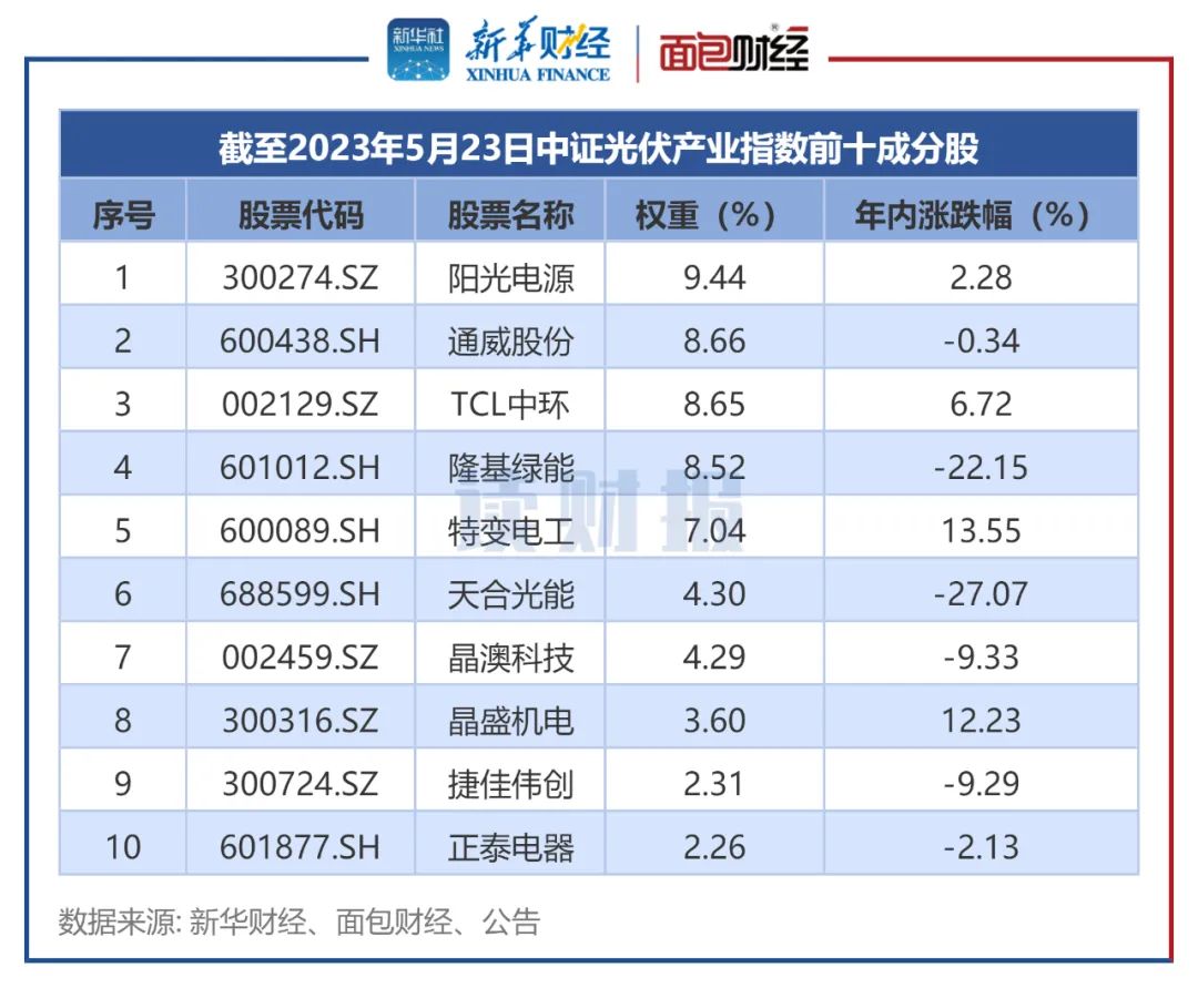 指数前十大成分股天合光能、隆基绿能年内股价跌超两成