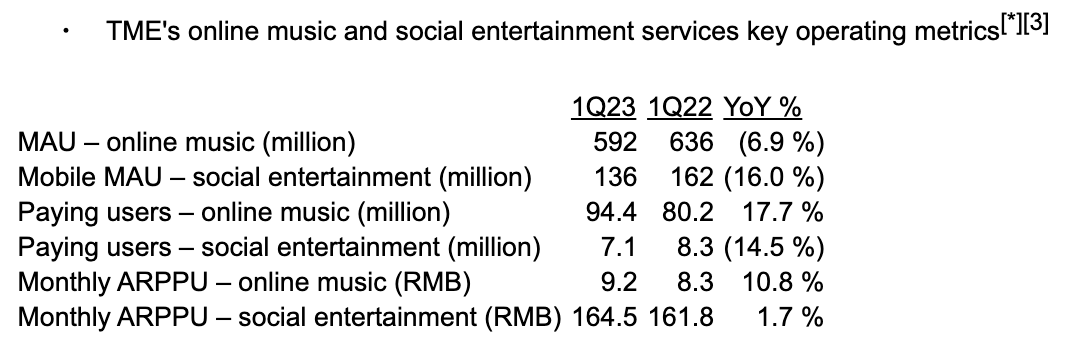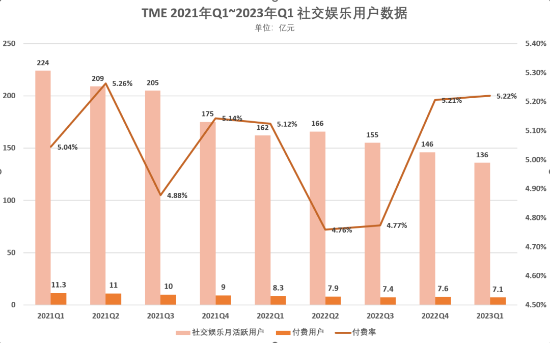 2023年一季度的财报数据显示,TME2023年第一季度营收70亿元,同比增长5.4%,在线音乐付费用户数至9440万,同比增长17.7%。第一季度在线音乐服务收入35.0亿,同比增长33.8%,其中在线音乐订阅收入达26.0亿元,同比提升30.4%。