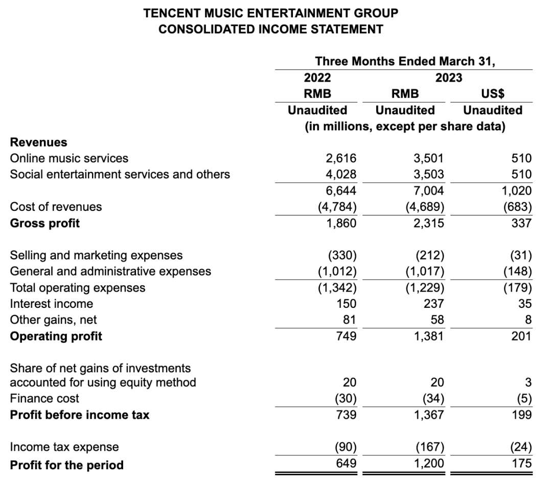 5月16日,TME公布了2023年第一季度未经审计财报,据财报显示,腾讯音乐2023年第一季度营收70亿元,同比增长5.4%,终于止住此前同比五连跌的势头,同时第一季度净利润为11.5亿元,同比大增88.5%。