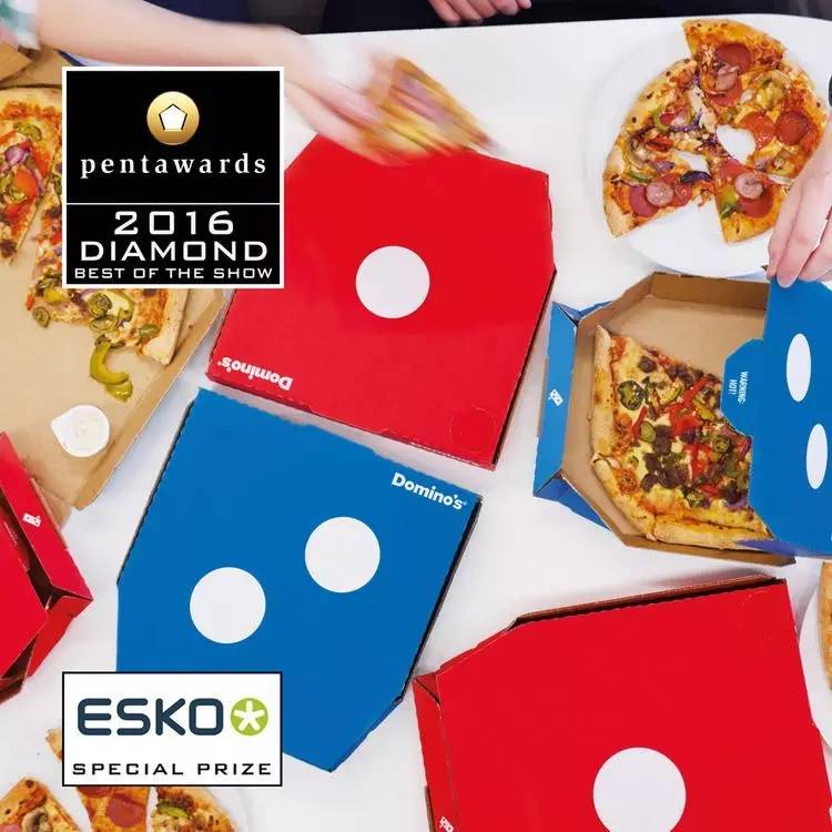 比如拿下今年 Pentawards 最高荣誉钻石奖的达美乐披萨外卖包装盒,JKR (Jones Knowles Ritchie 设计公司)团队把达美乐原本包装盒上的复杂信息全部去掉,唯独只留下能代表企业标识的、更有穿透性的“红蓝两色+白色圆点”,他们希望客人在家(或公司)接到食物的瞬间第一反应是达美乐,而不是比萨。