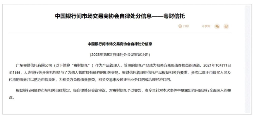 而此次接受自律处分,是因为粤财信托作为产品管理人,管理的信托产品成为相关方兑现债券损益的通道。
