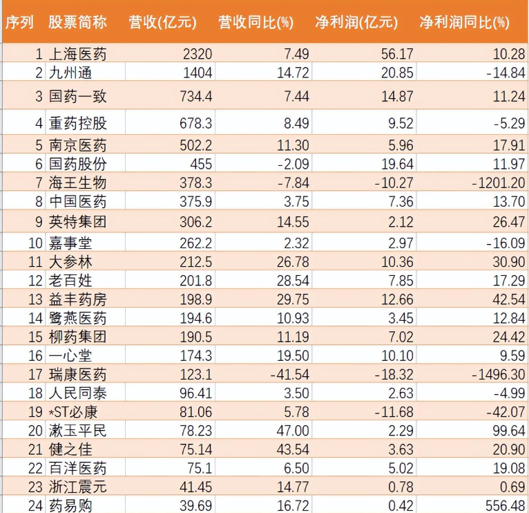 九州通、国药股份排名第二和第三,净利润分别为20.85亿元、19.64亿元。据悉,九州通是一家以西药、中药和医疗器械批发、物流配送、零售连锁以及电子商务为核心业务的股份制企业。