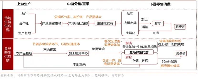 生鲜上,盒马的供应链已经下沉到源头产地,在全国建设了近600个直采基地,150多个“盒马村”,包括源头基地、盒马村、盒马产地仓、盒马销地仓、盒马门店等在内的供应链体系,实现了“产供销”的一体化。
