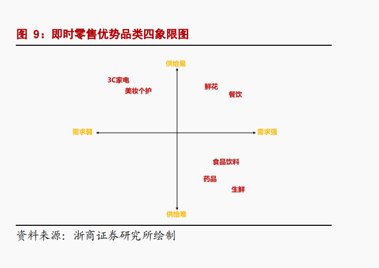 在即时零售的实物商品里,短保、即时性强、高频的品类最容易渗透,如生鲜,其次是短保、即时性强、低频的种类,比如鲜花、蛋糕。