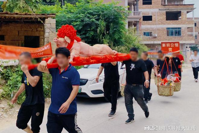 “恭喜郭先生,喜提特房新玥公馆”,在鞭炮声中,一支由12个人组成的贺喜队伍,抬着两头戴着大红花的猪,挑着扁担,浩浩荡荡地走进位于厦门市同安区的郭山村。