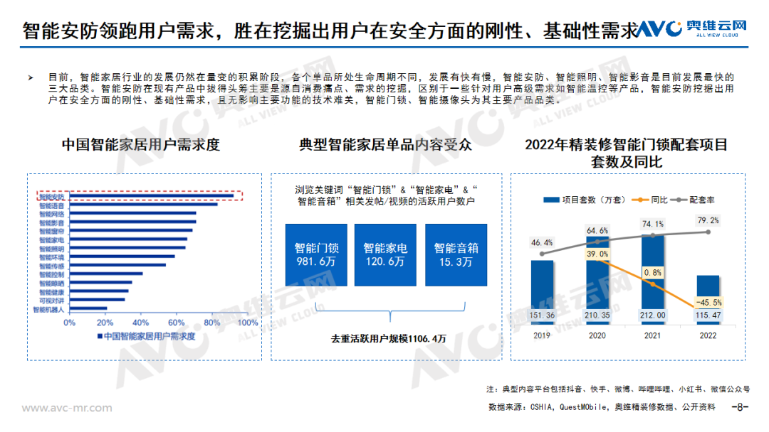 智能家居行业的发展仍然在量变的积累阶段,各个单品所处生命周期不同,发展有快有慢,智能安防、智能照明、智能影音是目前发展最快的三大品类。