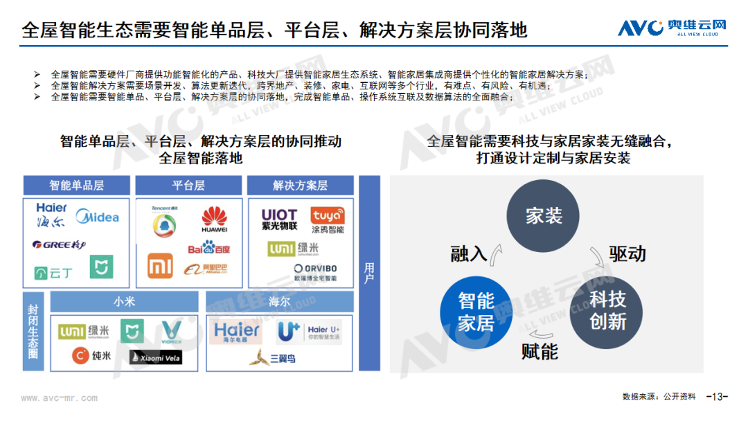 全屋智能生态的长远发展需要智能单品层、平台层、解决方案层协同落地。全屋智能需要硬件厂商提供功能智能化的产品、科技大厂提供智能家居生态系统、智能家居集成商提供个性化的智能家居解决方案;全屋智能解决方案需要场景开发、算法更新迭代,跨界地产、装修、家电、互联网等多个行业,有难点、有风险、有机遇;全屋智能需要智能单品、平台层、解决方案层的协同落地,完成智能单品、操作系统互联及数据算法的全面融合。