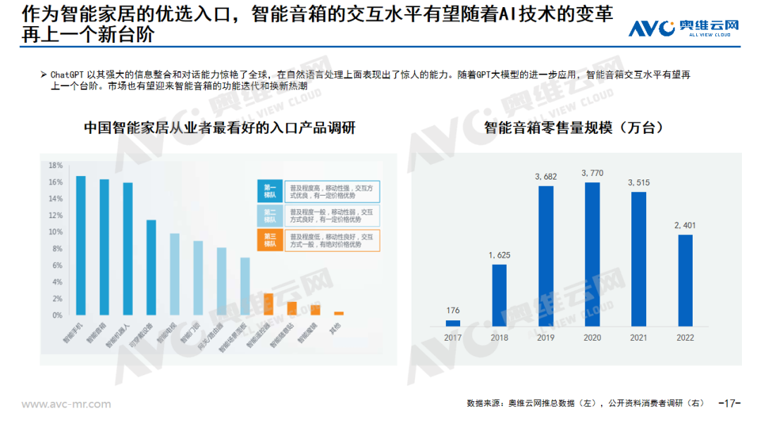 智能家居行业的发展仍然在量变的积累阶段,各智能单品的发展节奏也有快有慢。以智能家电零售渠道数据为例,奥维云网(AVC)推总数据显示2022年智能空调的零售量超过4000万套,人工智能电视的规模超过2500万台,智能音箱、智能厨电的零售量亦超过2000万台。