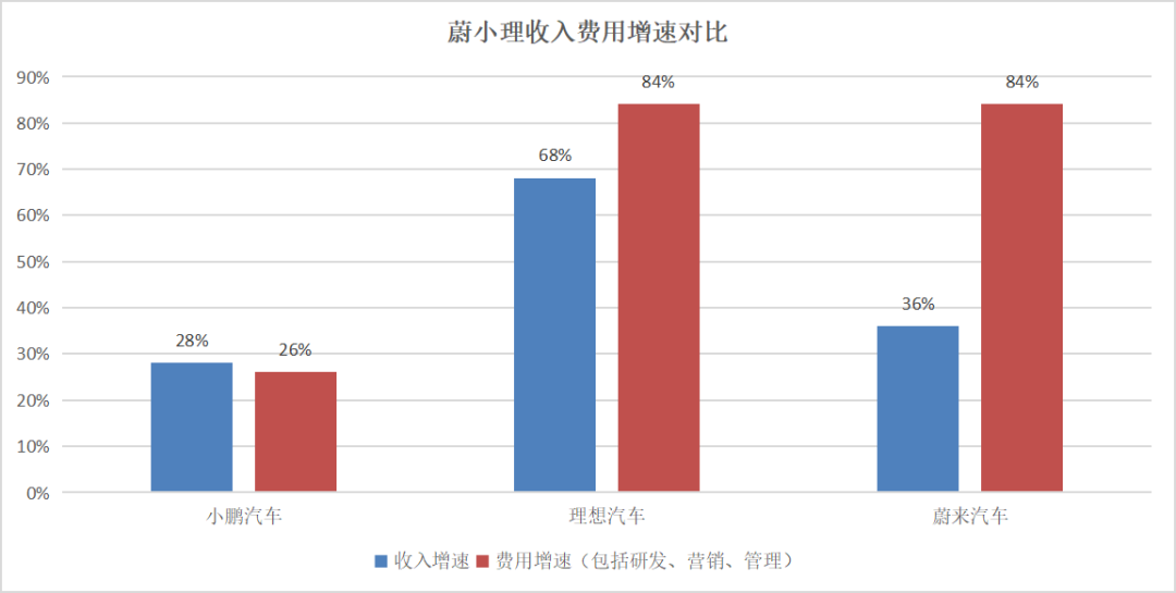 财报显示,2022年蔚来收入增长了36%,但费用端的研发、营销、换电站运营所支出的资金却增加了84%。身处相同的宏观和行业环境中,相比之下,其他两家造车新势力小鹏和理想的收入与费用相对平衡。2022年小鹏汽车收入虽然增长才28%,但费用也仅增长26%;理想汽车的费用增长了84%,但好在收入增长了68%。