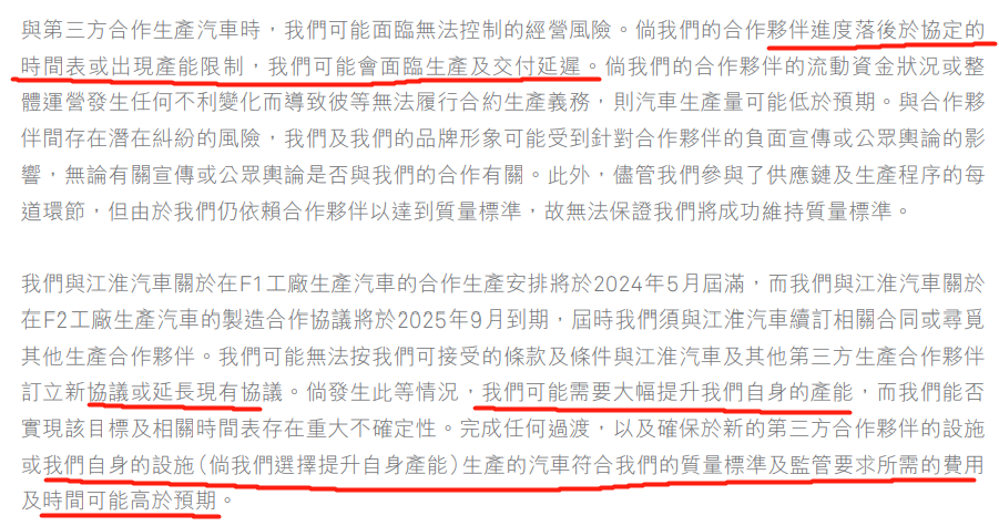大概理解为蔚来的电动车产能将长期依赖于第三方江淮或其他,生产与交付的能力都是第三方的事情,代工厂出现幺蛾子都会影响蔚来汽车的交付能力;然后,蔚来自建产能短期是不可能的,造不出是一回事,而且这会大大提高蔚来的费用预期。