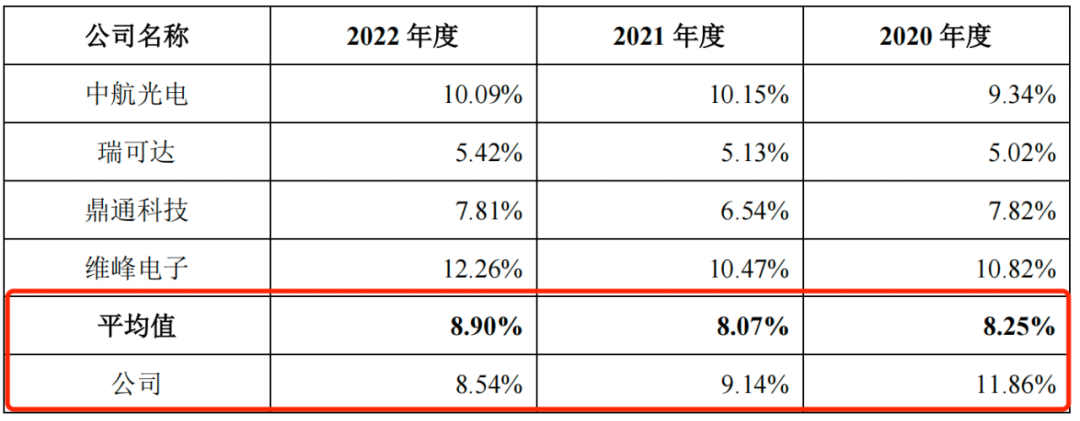 盛联电子的研发费用率逐年下滑,而同行公司却逆势走高,在2022年,同行公司的研发费用率平均值已经超过了盛凌电子。