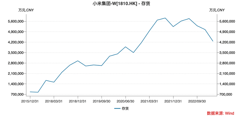 库存管理能力一直是评判硬件销售企业经营效率的重要指标,在过去几年,在主营业务的迅速扩张中,小米库存也进行了非常明显的膨胀。该节奏在2021下半年之后戛然而止,随着市场需求萎靡迹象的日益加重,小米开始控制库存增长, 2022下半年之后,该指标更是呈自由落体式收缩。