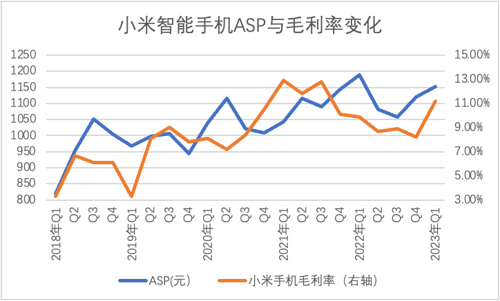 我们整理了小米手机ASP(平均手机售价)与毛利率的关系,可以非常清楚看到在大多数时间两者呈非常确切的正相关性。与此同时,我们亦可以看到2022年下半年由ASP下行导致毛利率大滑坡,彼时经营压力之大足可见一斑。