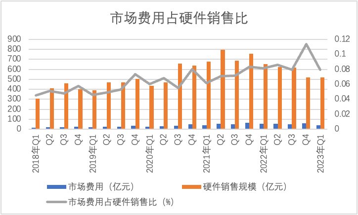 压缩市场费用已经是中概企业的最常规做法,小米也不例外(销售市场费用由上年同期的59亿元减少至2023年Q1的41亿元)。由于硬件销售为市场费用的主要目的,我们制作下图。