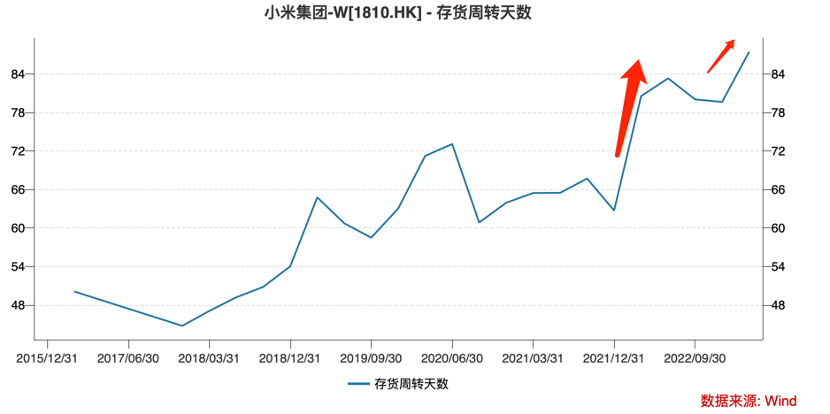 受制于总营收下行以及前期膨胀的库存规模干扰,使得小米库存周转天数陡增,接下来将进入库存规模下行区间(分母将触顶下行),其库存周转压力应该会得到一定程度的缓解。这也就降低了分子的压力,不需要过分降价牺牲盈利性。