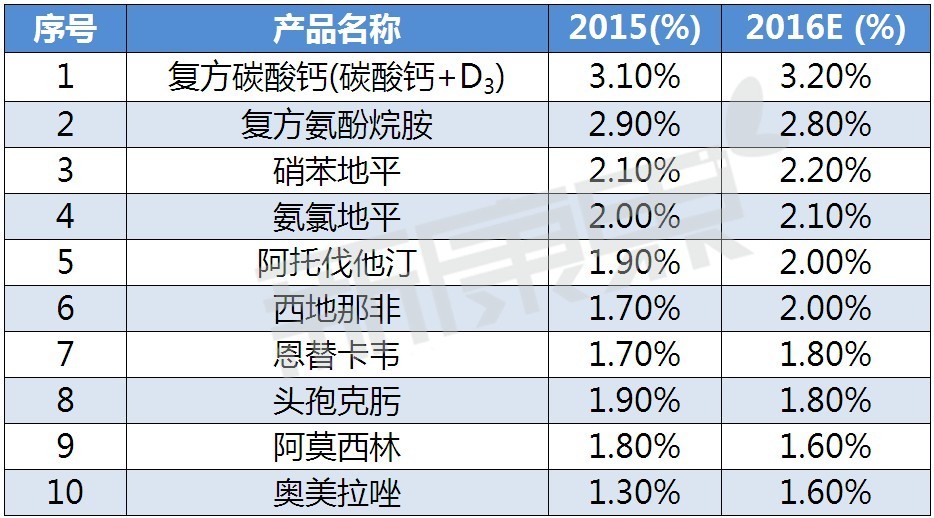 在钙制剂产品中,碳酸钙是当前同等质量产品中钙含量最高的,因而市场一路走高。中康CMH数据显示,2015年零售市场化学药销售达1124亿元,其中,复方碳酸钙(碳酸钙+维生素D3)以3.1%的市场份额成为化学药畅销产品排行榜第一名。