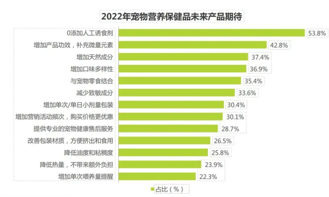 另外是宠物保健产品本身的丰富度和消费场景的多元化上的问题。从《中国宠物健康消费白皮书》中能够看到,2022年消费者对宠物保健品的期待,包括产品是否添加诱食剂、功能是否丰富、口味是否多样、成分是否天然等。