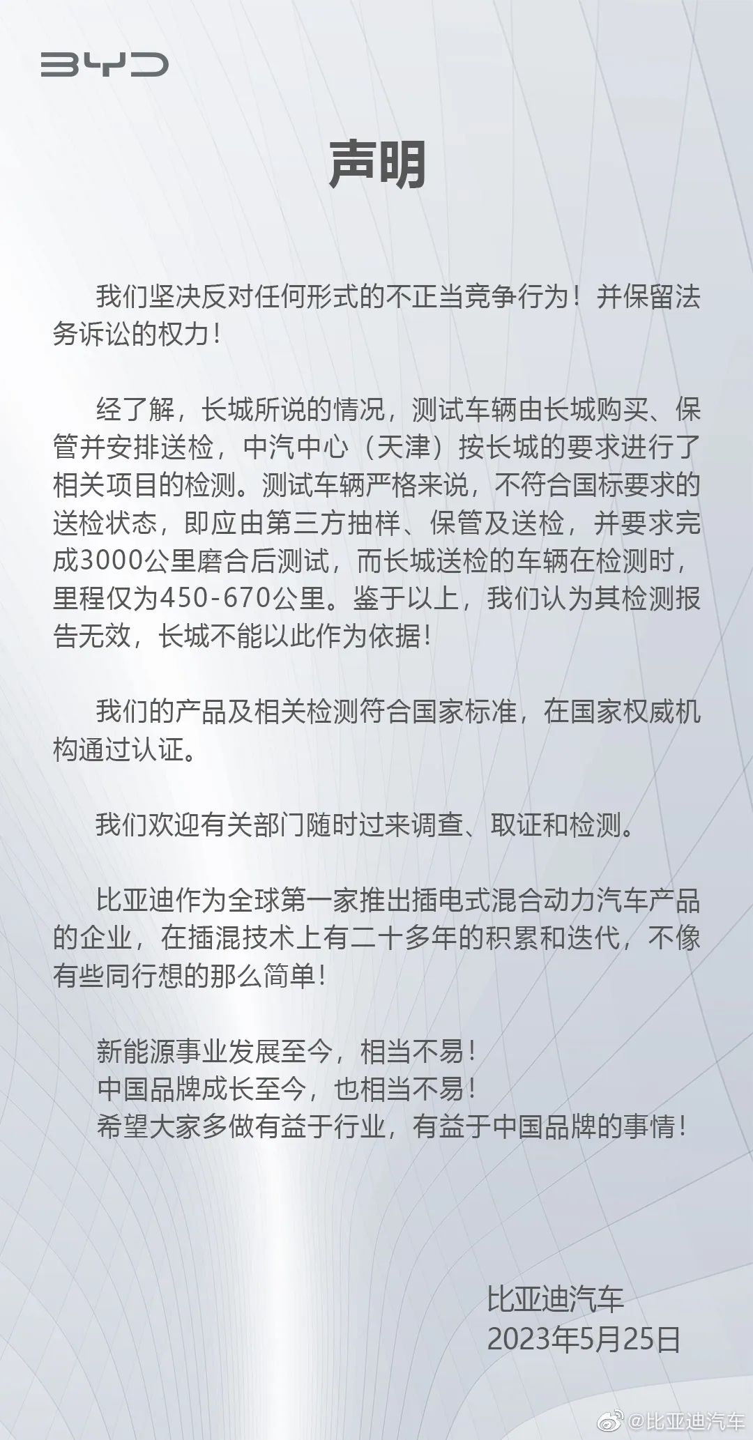 比亚迪还表示,测试车辆是由长城购买、保管并安排送检,中汽中心(天津)按长城的要求进行了相关项目的检测。严格来说该测试车辆并不符合国标要求的送检状态,即由第三方抽样、保管及送检,完成3000公里磨合后测试,而长城送检的车辆检测时里程仅为450-670公里。鉴于以上,认为检测报告无效。“比亚迪在插混技术上有二十多年的积累和迭代,不像有些同行想的那么简单!”