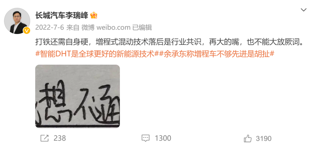 2022年,长城汽车魏牌CEO李瑞峰又炮轰增程式混动技术,言语中直指华为智能汽车解决方案BU CEO余承东、以及华为与赛力斯合作的问界系列。“打铁还需自身硬,增程式混动技术落后是行业共识,再大的嘴,也不能大放厥词。”