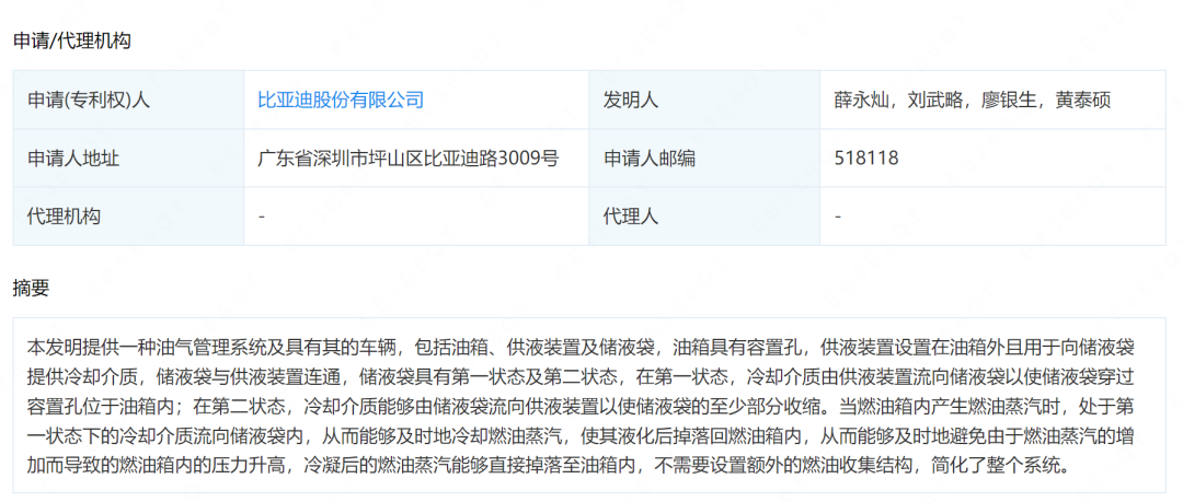 但值得注意的是,比亚迪在油气方面也申请了不少专利。比如一项在2021年3月申请,目前正在“审中”的“油气管理系统及具有其的车辆”专利,其可以实现燃油蒸汽液化后掉落回油箱内,从而避免因燃油蒸汽过多导致的油箱压力升高。