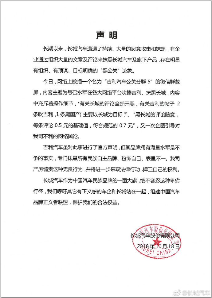 2018年,长城汽车在官方微博声明称,遭到了某品牌“黑公关”的恶意攻击,其中便涉及吉利汽车(0175.HK)。声明提到,一个名为“吉利汽车公关分群5”的微信群内容主题为号召水军在各大网络平台吹捧吉利、抹黑长城,“吉利汽车虽对此事进行了官方声明,但某品牌拥有海量水军是不争的事实”。