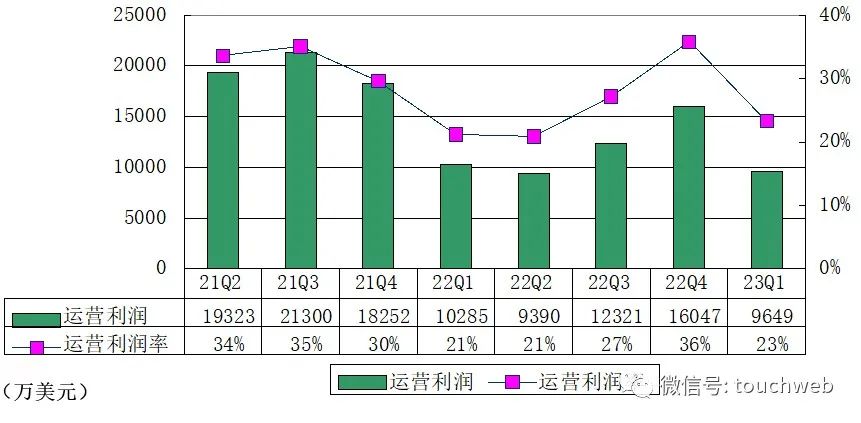 微博2023年第一季度的经营利润为9650万美元,上年同期为102.8百万美元。2023年第一季度经营利润率为23%,去年同期为21%。