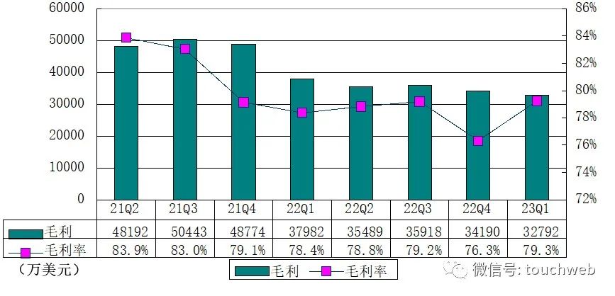 微博2023年第一季度毛利为3.28亿美元,毛利率为79.3%。