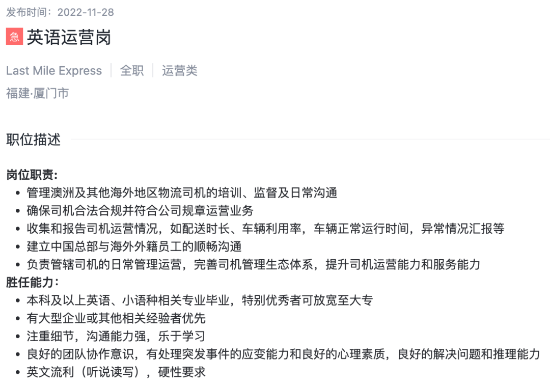 2022年末,趣店曾发布英语运营岗位人才招聘信息。从职位描述来看,该岗位人员主要负责澳洲及其他海外地区物流司机的日常管理运营工作。