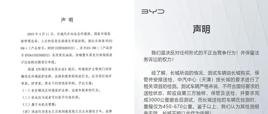 5月25日,长城汽车在自己的官方媒体上公开发布了声明,称自己于4月11日已经向国家有关部门递交举报材料,就比亚迪秦PLUSDM-i、宋PLUS DM-i采用常压油箱,涉嫌整车蒸发污染物排放不达标的问题进行举报。