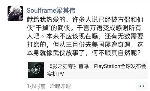 发布会结束后,灵游坊创始人、《影之刃零》制作人梁其伟抑不住兴奋劲,发朋友圈表示《影之刃零》就是献给自己热爱的武侠。同时我朋友圈里不少其他游戏同仁,也转发《影之刃零》的PV视频,表达了期待之情。