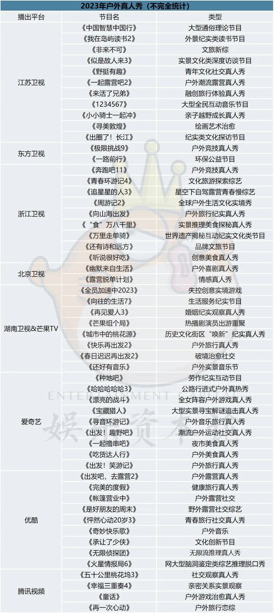而最近,结合去年发布的片单以及近来各卫视、平台招商会透露的信息,娱乐资本论对2023年的综艺项目进行了一番梳理后发现,户外真人秀或者说户外作为一项元素越发受到生产端青睐。