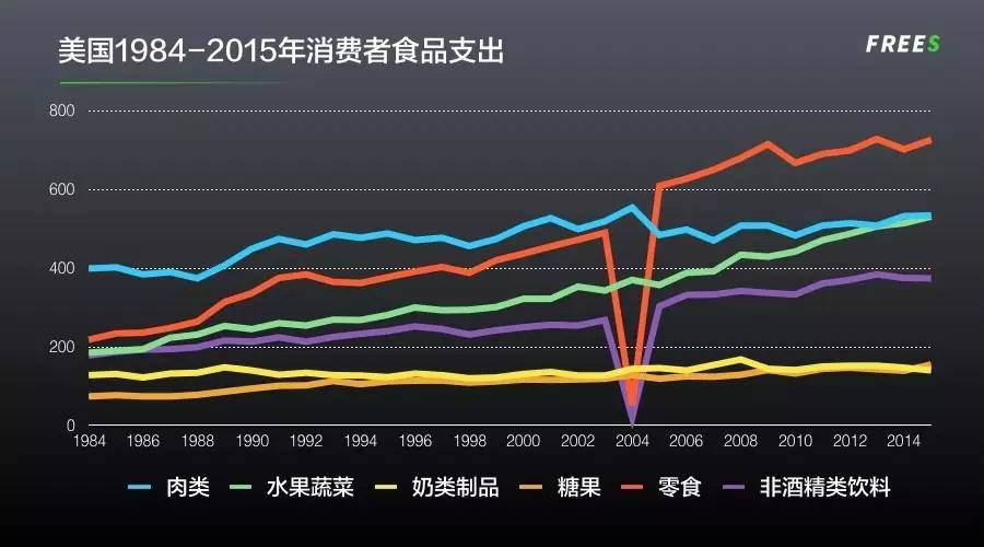 ▲ 美国 1984-2015 年消费者食品人均年支出变化,来源于美国劳工统计局官网(注:2004 年特殊值的出现是统计数据缺失造成,并非真实数值波动)