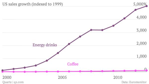 ▲ 2000-2013 年咖啡、能量饮料销量增速对比(深色为能量饮料;浅色为咖啡)