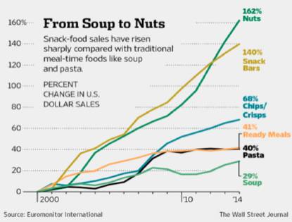 特别在进入 21 世纪以后,美国零食的增长速度远远超过了正餐。根据华尔街日报,我们可以看到,从 2000 年到 2014 这 15 年之间,薯片、坚果和能量棒的销售增长率分别高达 68%、140% 和 162%,传统正餐食品例如汤和意大利面条的增长率仅有 29% 和 40%。