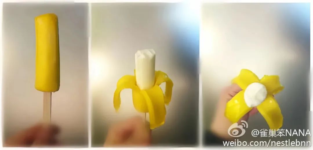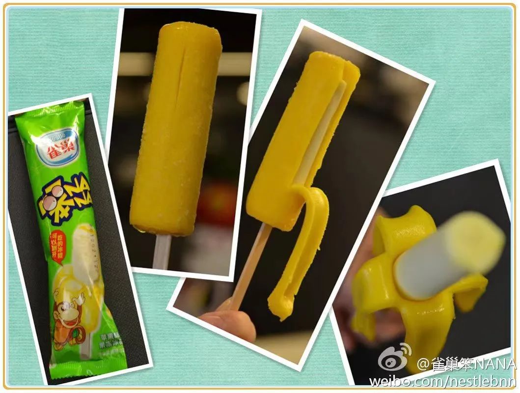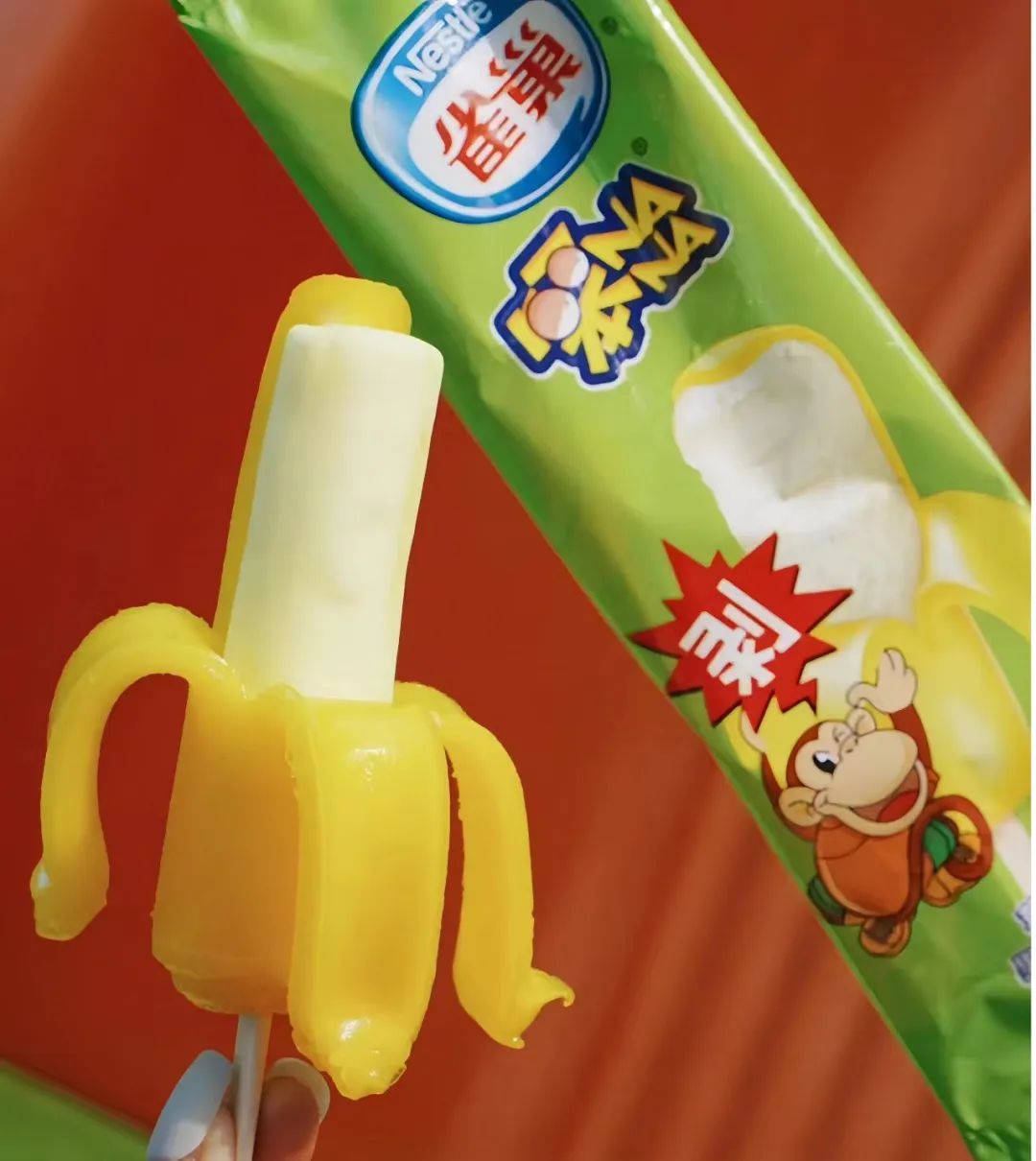 笨NANA的成功,离不开它本身的趣味性和独特设计。外形酷似香蕉,名字谐音“banana”(香蕉),声形上都与其可像香蕉一样剥开食用的特点相符。剥开类似果冻的可食用外皮后,即可尝到内部的牛奶味雪糕。雀巢采用互动思维来设计笨NANA,旨在让消费者在与产品的互动中建立情感联系,带来一种“边吃边玩”的有趣体验。该创意在当时的较为“朴素”的冰淇淋产品中较为新颖,或许也正是这种“差异化”,让笨NANA自带流量“buff”。