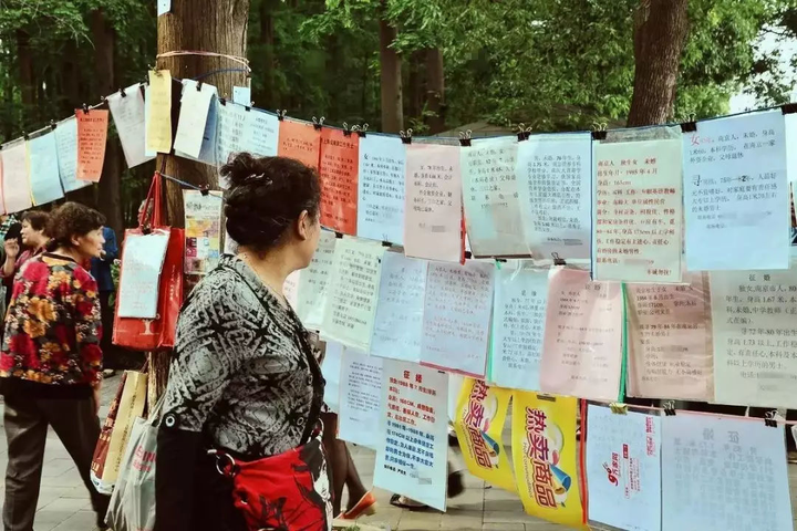 周末的公园相亲角挤满了人,大约上百份个人资料鳞次栉比地挂成一排,一旁围绕着为子女着急张罗的父母,作为婚恋主角的年轻男女却鲜有到场或是面露难色。