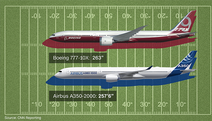 空客A350-2000的机身长度接近258英尺(约合78.64米),在常规状态下可以容纳400名乘客。波音777-10X的机身长度接近263英尺(约合80.16米),在常规状态下可容纳450名乘客。相比目前两家公司最大的客机A350和777X,这两款飞机可相应地多容纳30名和50名乘客。