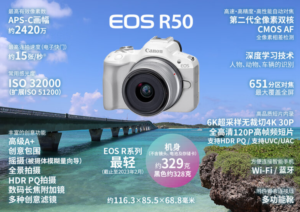 先聊相机,在今年索尼、佳能和富士先后推出了自家的入门级产品,它们的卖点几乎都是相同的:小巧轻便且外观清新好看。就以爆火到缺货溢价的佳能R50为例,它的单机重量只有329g,而大部分微单相机的重量都在600g以上,搭配佳能独一档的人像效果和简单易上手的操作系统(没有专业微单的各种复杂功能,基本按下快门就能出片),一发售就出现缺货溢价的情况,足见佳能对于女性市场的见解相当到位。