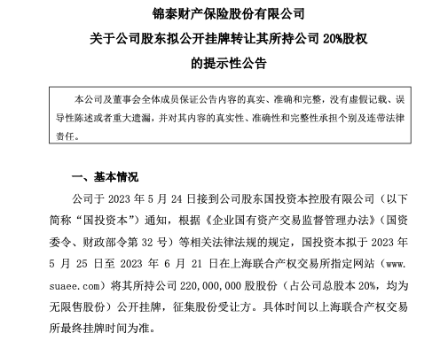 5月25日,锦泰财险 (870026.NQ)发布公告称,公司于2023年5月24日接到公司股东国投资本控股有限公司(以下简称“国投资本”)通知,拟于2023年5月25日至2023年6月21日在上海联合产权交易所挂牌转让其所持公司2.2亿股股份(占公司总股本20%)公开挂牌,征集股份受让方。