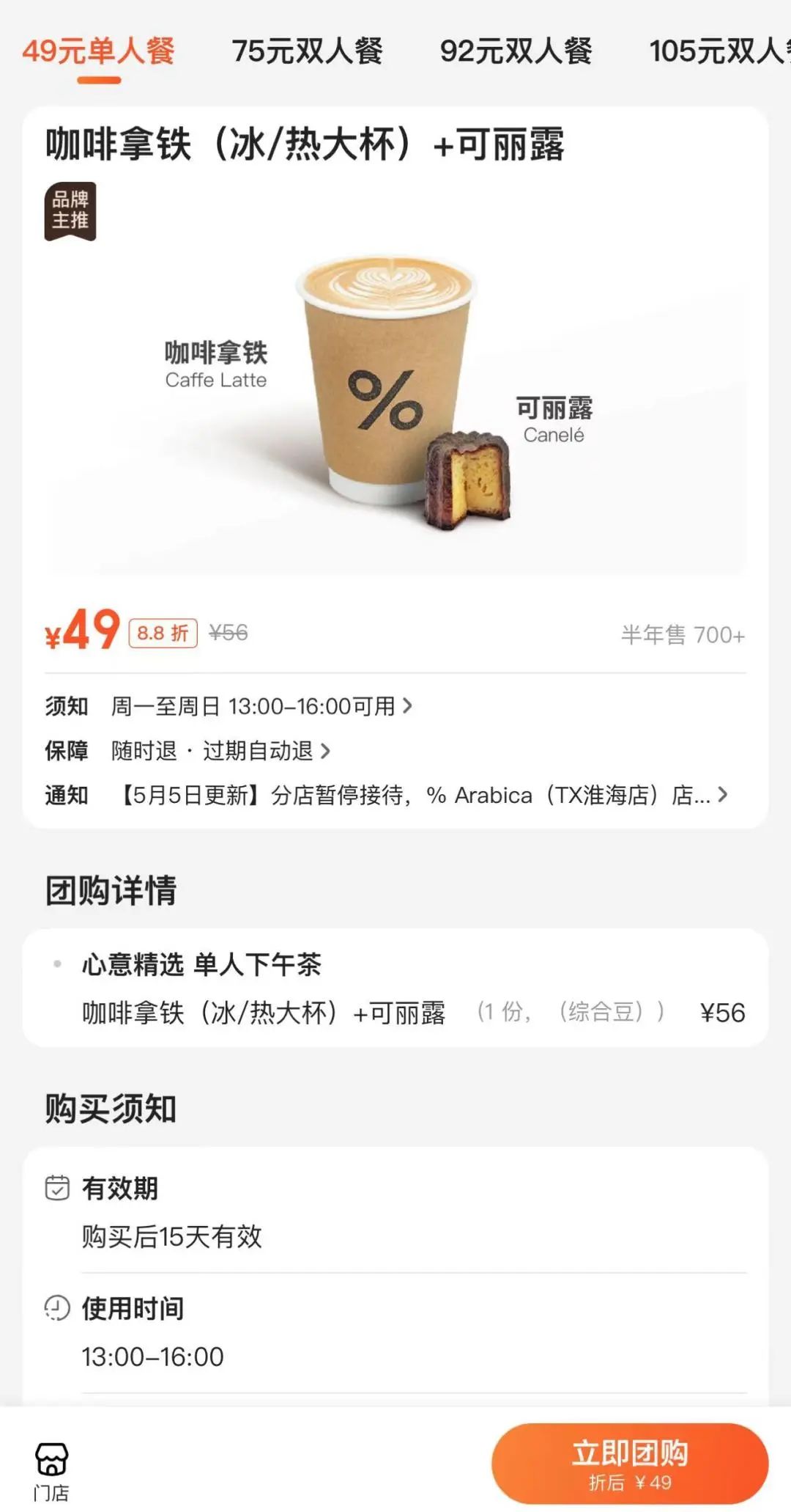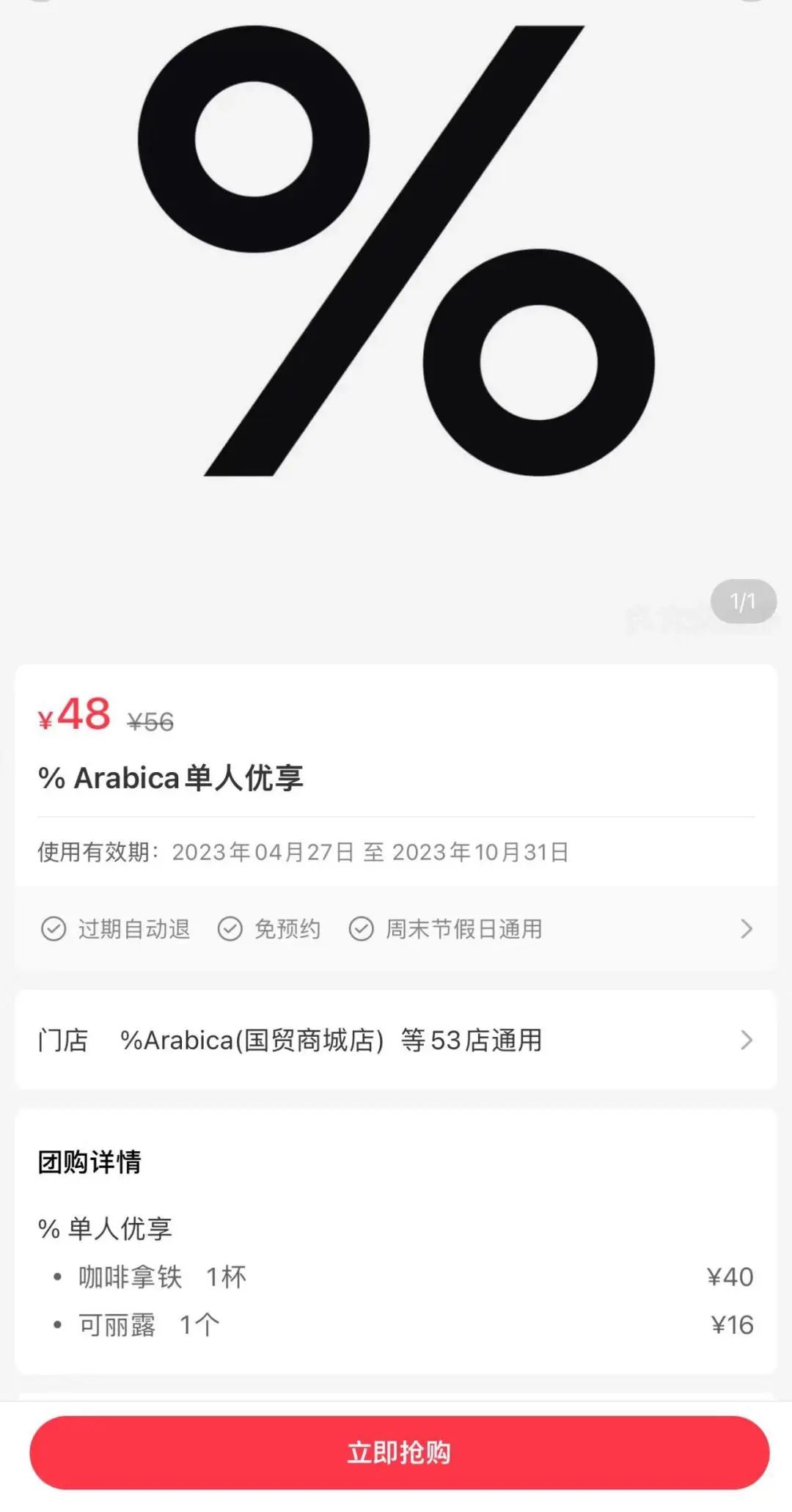 盒饭财经发现,网红咖啡店%Arabica目前在抖音暂未上架团购商品,但成为了首批在小红书上架团购商品的咖啡品牌商家,其在小红书上架的团购套餐包括48元的单人套餐——刚好比大众点评低一元。